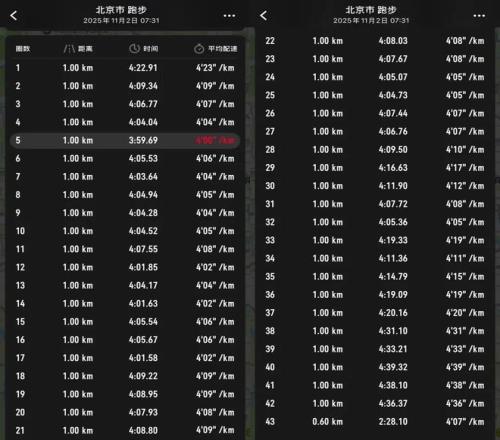 跟他跑了500米后,我自己真不行了,當時(shí)配速掉到419-420。37公里后,北馬最大的一個(gè)爬升出現了。在奧林東橋上橋時(shí),我徹底廢了——如果沒(méi)這段爬升,也許最多掉到430左右 ,最后以2575幾完賽,但我徹底崩在了這里。崩完后,我用438-439順了兩公里。