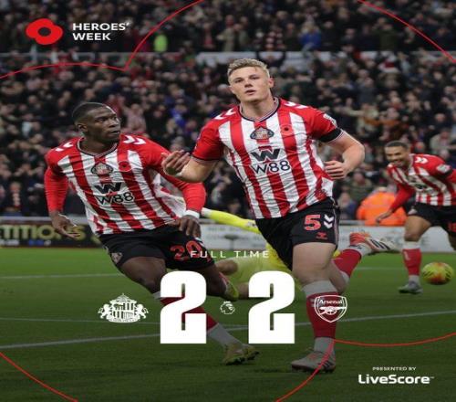 北京時(shí)間11月9日01:30,英超聯(lián)賽第11輪,阿森納客場(chǎng)挑戰桑德蘭。上半場(chǎng),巴拉德破門(mén)首開(kāi)紀錄。阿森納半場(chǎng)0-1落后桑德蘭。下半場(chǎng),梅里諾助攻薩卡扳平,蘇維門(mén)迪有一腳射門(mén)擊中橫梁,隨后特羅薩德世界波反超,布羅比補時(shí)絕平。最終阿森納2-2戰平桑德蘭,阿森納各項賽事10連勝勢頭被終結,暫以7分優(yōu)勢領(lǐng)跑英超。