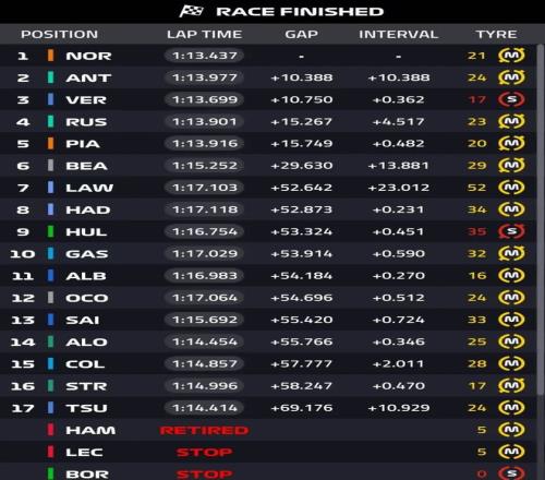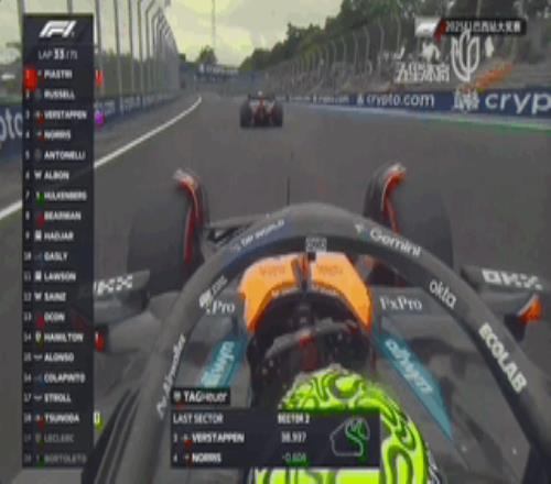 安東內利換上新黃胎后一路猛追到第7,而諾里斯在第31圈選擇進(jìn)站換上一套舊紅胎,這意味著(zhù)諾里斯也準備兩停,紅胎帶來(lái)的圈速提升讓諾里斯很快就在第33圈超過(guò)維斯塔潘來(lái)到第三的位置。
