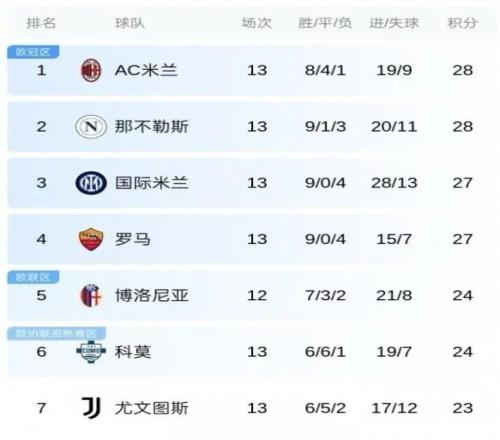 意甲第13輪,羅馬0-1不敵那不勒斯,讓出榜首。米蘭與那不勒斯同分分列前二,羅馬輸球后從第一掉至第四,國米升第三。