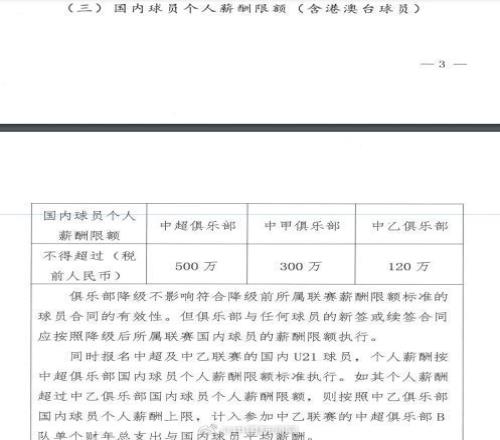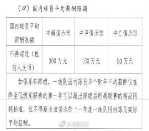 中國足球職業(yè)聯(lián)賽聯(lián)合會(huì )發(fā)布關(guān)于印發(fā)中國足球職業(yè)聯(lián)賽俱樂(lè )部財務(wù)約定指標的通知。通知規定:國內球員年薪限額分別為500萬(wàn)(中超)、300萬(wàn)(中甲)和120萬(wàn)(中乙);國內球員平均薪酬分別為300萬(wàn)(中超)、150萬(wàn)(中甲)和50萬(wàn)(中乙)。