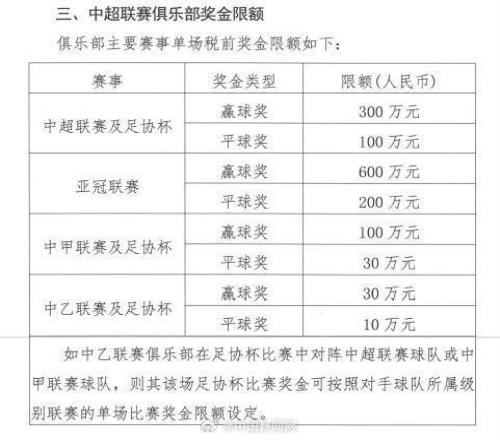 此外,中足聯(lián)印發(fā)三級聯(lián)賽財務(wù)指標,其中包含俱樂(lè )部獎金限額。中超球隊聯(lián)賽單場(chǎng)贏(yíng)球獎金不得超過(guò)300萬(wàn)元。