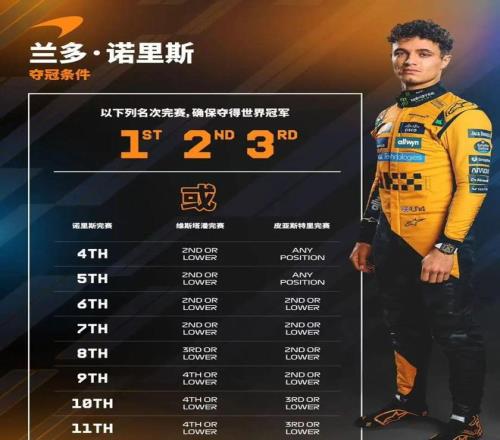 從積分情況看,諾里斯是三人中奪冠形勢最好的一位。他只需在阿布扎比取得前三名,即可確保年度冠軍。這位英國車(chē)手憑借全年的穩定發(fā)揮成為現階段最接近冠軍的車(chē)手。
