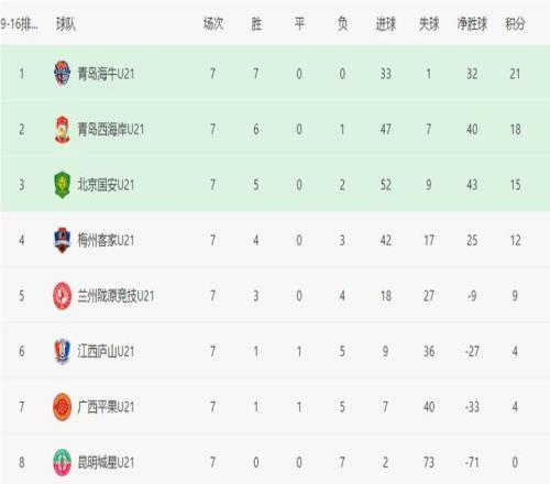 青島海牛U21、青島西海岸U21以7-0的同樣比分,大勝廣西平果U21、蘭州隴原競技U21,完美收官。其中,青島海牛U21豪取7連勝,而且僅丟1球,最終積21分,位列L組榜首,總成績(jì)第9。青島西海岸U21緊隨其后,積18分,排名總成績(jì)第10。梅州客家U21積12分,總排名第12。蘭州隴原競技U21、江西廬山U21、廣西平果U21、昆明城星U21,分列總成績(jì)第13至16。其中,昆明城星U21遭遇7連敗,而且僅進(jìn)2球,狂丟73球,數據有些慘。