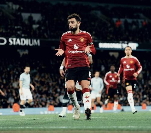 當然,中前場(chǎng)也有“傳統藝能”。隊長(cháng)B費標志性的攤手動(dòng)作早已成為個(gè)人Logo。但2024年曼市德比他將其升華,進(jìn)球后雙手一攤,順利過(guò)關(guān)。這記“攤手慶?!迸c那場(chǎng)絕地逆轉一道,成為了歷史經(jīng)典。