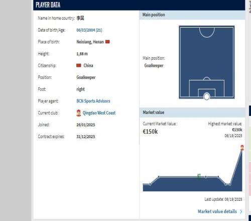 李昊現今21歲,司職門(mén)將,國青主力,曾留洋馬德里競技。25賽季,他效力于青島西海岸,出場(chǎng)29次,完成8次零封,84次撲救,14次出擊,這三項數據均中超前五水平。