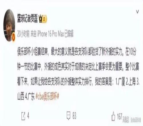經(jīng)過(guò)休賽期的厲兵秣馬,各隊的引援工作,如今基本上進(jìn)入尾聲。通過(guò)俱樂(lè )部杯賽的檢驗,各隊所引進(jìn)的外援“是騾子是馬”,也基本看出了端倪。日前,國內著(zhù)名體育記者賈磊排出了新賽季的外援實(shí)力榜,這位資深媒體人,通過(guò)俱樂(lè )部杯賽各隊的外援表現,分析得出結論,認為外援實(shí)力最強的四支球隊,分別是廣廈男籃、上海男籃、山西男籃和廣東男籃。
