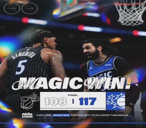 魔術(shù)趁勢拉開(kāi)分差,整個(gè)第四節都沒(méi)有再讓熱火追上,于是他們以117比108擊敗了熱火,打進(jìn)了本屆NBA杯賽的半決賽,也就是說(shuō)拿到了一個(gè)四強席位。