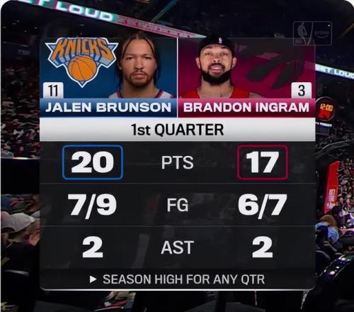 首節開(kāi)場(chǎng)兩隊的核心人物對轟,兩人都打滿(mǎn)12分鐘,布倫森9中7+6中4拿到20分2助攻,英格拉姆7中6+三分1中1拿到17分3籃板2助攻2搶斷,英格拉姆在最后1分鐘幫助猛龍領(lǐng)先結束首節。