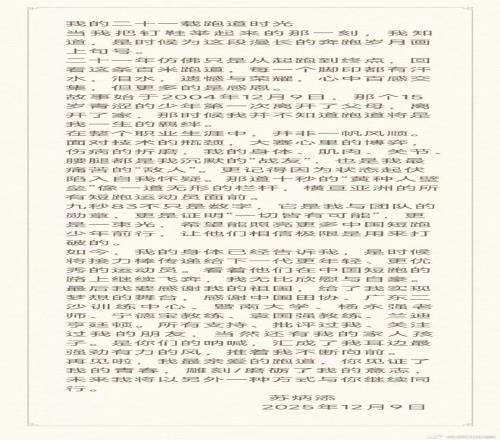 北京時(shí)間12月9日,男子100米亞洲紀錄保持者、中國短跑名將蘇炳添正式宣布退役。他在社交媒體中寫(xiě)道:“再見(jiàn)啦,我最親愛(ài)的跑道,你見(jiàn)證了我的青春,雕刻/磨礪了我的意志,未來(lái)我將以另外一種方式與你繼續同行?!?/strong>