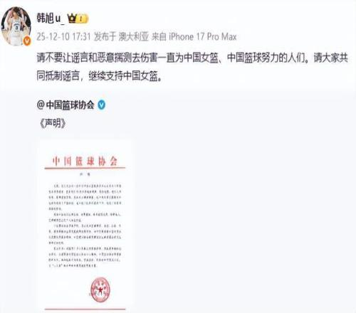 北京時(shí)間12月10日下午,中國籃協(xié)突然發(fā)布了一張紅頭文件,為中國女籃教練員和運動(dòng)員發(fā)聲,力挺中國女籃。連遠在澳大利亞的韓旭也站了出來(lái),一起發(fā)聲。