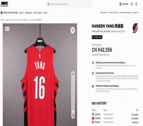 北京時(shí)間12月16日,楊瀚森在12月8日開(kāi)拓者對陣灰熊的比賽中穿著(zhù)的球衣在拍賣(mài)網(wǎng)站上成交。