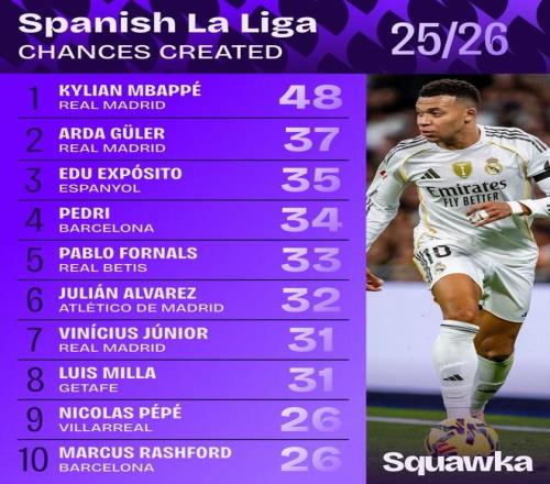 根據統計,本賽季到目前為止,姆巴佩是西甲當中創(chuàng )造機會(huì )最多的球員,居萊爾位居第二,西班牙人中場(chǎng)埃杜位居第三。