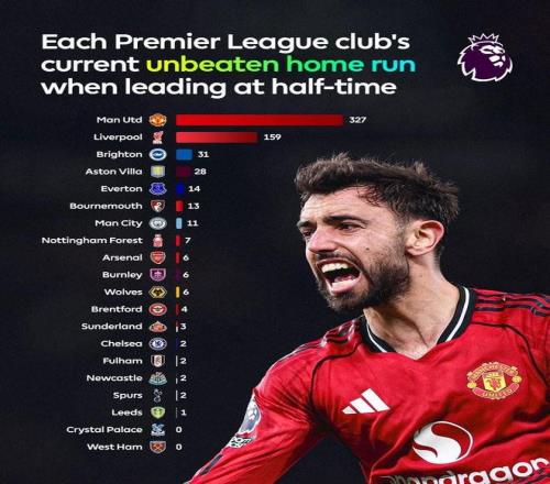 英超主場(chǎng)半場(chǎng)領(lǐng)先連續不敗紀錄: