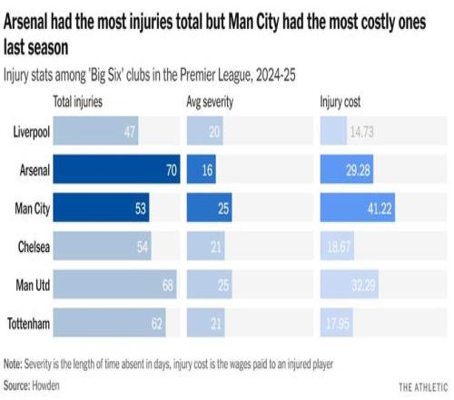 與此同時(shí),單看上個(gè)賽季,他們的對手曼城在這項指標上損失最為慘重——盡管切爾西、阿森納、曼聯(lián)和托特納姆熱刺的傷病總數都更多。曼城遭遇了羅德里等關(guān)鍵球員的出勤問(wèn)題,因此受到的打擊更大。阿森納主帥米克爾-阿爾特塔則不得不應對更多短期傷病,其中包括許多邊緣球員。