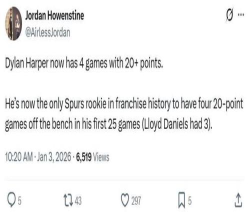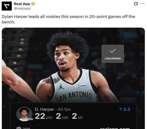 馬刺隊(duì)連續(xù)3年淘到寶!建隊(duì)基石文班缺席的情況下,新科榜眼哈珀扛起進(jìn)攻大旗,替補(bǔ)轟22分獨(dú)占25年新秀第一。
