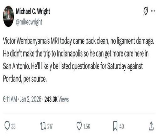 根據(jù)馬刺隊(duì)記Michael C. Wright報(bào)道,文班亞馬核磁共振結(jié)果顯示沒有韌帶損傷,下一場對(duì)陣開拓者的比賽依舊是出戰(zhàn)成疑。
