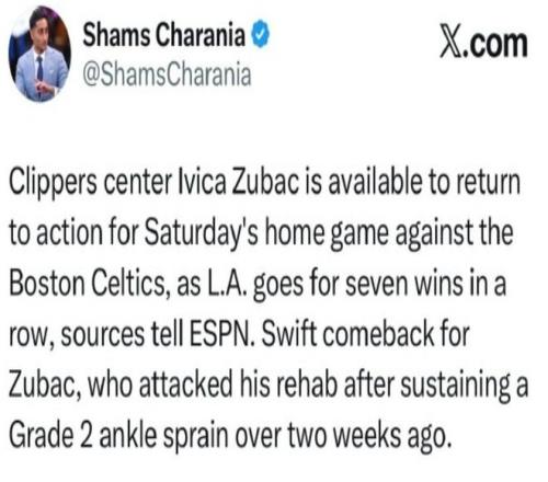 爆料王Shams:祖巴茨將在本周日快船主場(chǎng)VS凱爾特人比賽中復(fù)出。