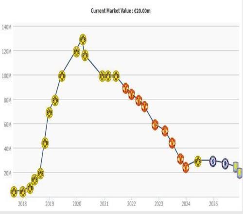 而根據(jù)德國轉(zhuǎn)會(huì)市場(chǎng)網(wǎng)站的歷史數(shù)據(jù),桑喬在2020年效力多特蒙德時(shí)身價(jià)曾高達(dá)1.3億歐元,而目前他的身價(jià)已跌至2000萬歐元。