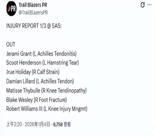 北京時(shí)間1月4日,開(kāi)拓者官方更新了球隊(duì)的傷病報(bào)告。今日背靠背對(duì)馬刺的比賽,格蘭特(左腳跟腱炎)、亨德森(左腿筋撕裂)、霍勒迪(右小腿扭傷)、利拉德(左跟腱傷?。?、塞布爾(右膝肌腱炎)、韋斯利(右腳骨折)和羅威(左膝傷病管理)均將缺席。其中,羅威按慣例背靠背缺陣,楊瀚森的機(jī)會(huì)又來(lái)了。