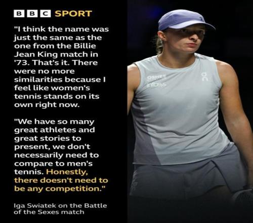 近日在迪拜舉行的網(wǎng)球性別大戰(zhàn)中,女單世界第一薩巴倫卡3比6、3比6不敵現(xiàn)男單世界排名第671位的前溫網(wǎng)男單亞軍克耶高斯。對此現(xiàn)女單排名世界第2的斯瓦泰克給出了自己的看法,她表示:“不,我沒看過,因為我不看這類東西。那是娛樂節(jié)目,但我認為它與社會變革或任何重要議題都無關。我想它的名字只是和1973年比利·簡·金的比賽一樣罷了,僅此而已,沒有更多相似之處。因為我認為女子網(wǎng)球現(xiàn)在本身就足夠出色。我們有這么多偉大的運動員和精彩的故事可以呈現(xiàn),沒必要和男子網(wǎng)球作比較,那是完全不同的歷史。
