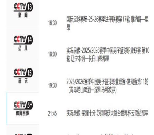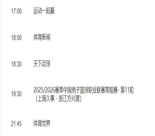 央視最新節(jié)目單顯示,央視體育頻道(CCTV5)、體育賽事頻道(CCTV5+)將現(xiàn)場(chǎng)直播2場(chǎng)。其中,CCTV5將從19:30開始,聚焦直播上海久事與衛(wèi)冕冠軍浙江廣廈方興渡的較量。