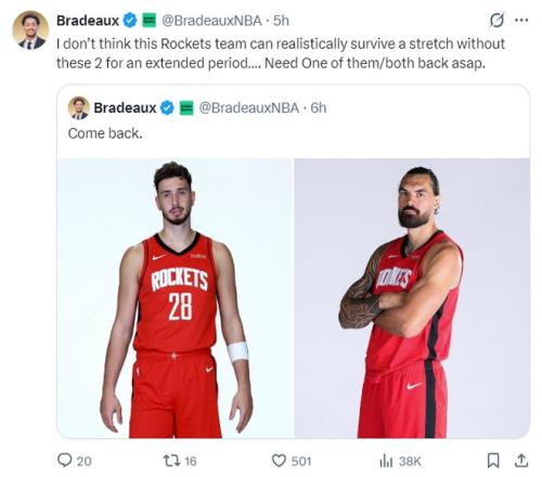 亞當(dāng)斯自12月30日后就因?yàn)槟_踝傷勢(shì)進(jìn)入傷病名單,火箭記者Bradeaux寫(xiě)道:我認(rèn)為火箭若長(zhǎng)期缺少這兩位球員,恐怕很難撐下去,急需阿爾佩倫-申京和史蒂文-亞當(dāng)斯其中一人/兩人盡快歸隊(duì)。