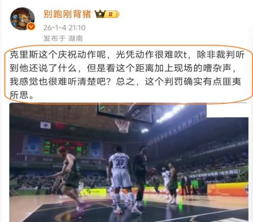 針對(duì)此事,CBA籃球記者“別跑剛背豬”,也是進(jìn)行了點(diǎn)評(píng),他表示從克里斯的動(dòng)作來(lái)看, 很難給他吹一個(gè)技術(shù)犯規(guī),也許他是說(shuō)了一些什么,但是現(xiàn)場(chǎng)很吵也很難聽(tīng)清楚,總之,裁判的這個(gè)吹罰,有點(diǎn)匪夷所思。