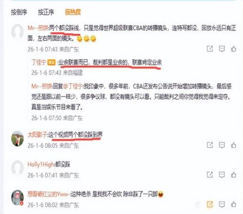 有球迷對此進(jìn)行評論,“兩個都沒踩線,只是覺得世界超級聯(lián)賽CBA的轉(zhuǎn)播鏡頭,連特寫都沒,回放永遠(yuǎn)只有正面,左右兩面的鏡頭?!倍〖褜幣c這位球迷互動時說:業(yè)余聯(lián)賽而已,裁判都是業(yè)余的,聯(lián)賽肯定業(yè)余。雖然丁佳寧沒有直接說踩不踩線,但是他說的話顯然認(rèn)同了球迷的看法,那就是兩人都沒有踩線。