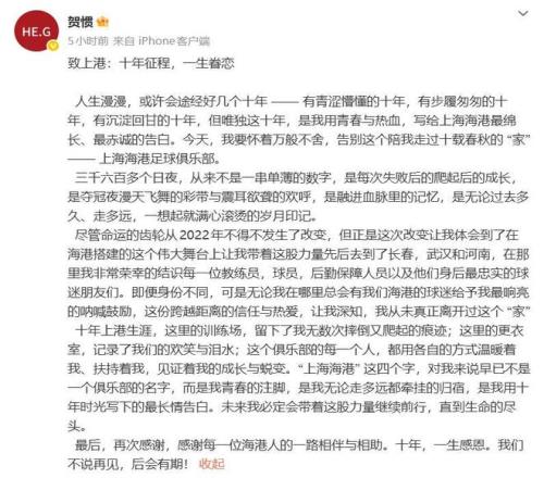同城球隊上海海港則再次面臨球員離隊,現(xiàn)年32歲的老將賀慣在個人社交賬號上發(fā)文告別球隊。賀慣自2013年加盟上港,總計代表上港出場209場,攻進(jìn)7球并送出4次助攻。但這幾個賽季,賀慣不斷被租借到其他中超球隊。
