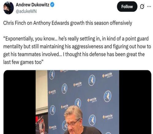 愛德華茲這樣的表現(xiàn)也獲得森林狼將帥的認(rèn)可,其中戈貝爾賽后坦言:“他的比賽慢下來了,他對比賽局勢的閱讀能力越來越強(qiáng),組織進(jìn)攻能力正在讓他變得無所不能,過去他討厭被包夾,如今我想他明白了,這種被包夾的方式其實(shí)是一種尊重的表現(xiàn)?!?/p>