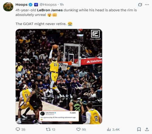 湖媒寫(xiě)道:41歲的詹姆斯還能再扣籃時(shí)頭超高籃筐,這簡(jiǎn)直太不可思議了,GOAT或許永遠(yuǎn)不該退役。