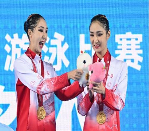 2025年11月15日,獲得十五運(yùn)會(huì)花樣游泳女子雙人項(xiàng)目冠軍的廣東隊(duì)組合王柳懿/王芊懿在領(lǐng)獎(jiǎng)臺(tái)上與吉祥物互動(dòng)。新華社發(fā)