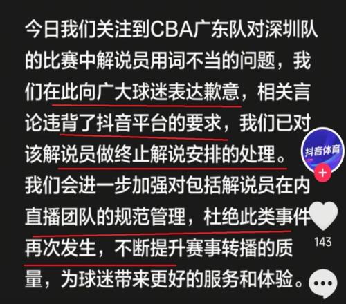 在深夜12點(diǎn),抖音平臺(tái)也是在第一時(shí)間對(duì)此事進(jìn)行了處理,對(duì)該解說(shuō)員做終止解說(shuō)安排的處理。同時(shí),也是向廣大廣東隊(duì)球迷表達(dá)歉意!