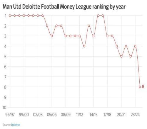 曼聯(lián)在金錢聯(lián)賽榜的下滑軌跡
